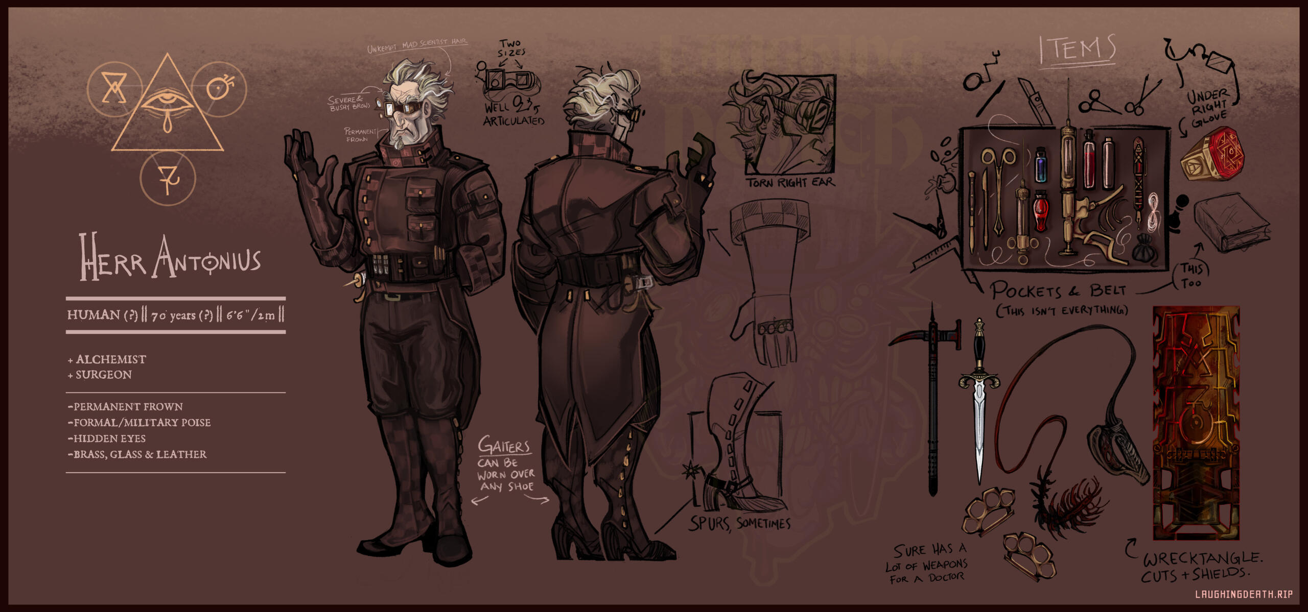 DR. H. M. H. ANTONIUS is a man with titles and distinctions as numerous as any decorated officer, and has committed as many crimes against humanity to earn them on subtler, though no less bloody, battlefields. In the art of medicine and the occult science of alchemy, few men have ever matched him in extraordinary insight and an unconscienced willingness to test the limits of mortality, and society's tolerance for such experiments thereby.Antonius achieved the lofty title of Grandmaster Alchemist at the respectable age of twenty-seven, an honor typically reserved for intellectuals whose work has spanned many more decades. The vehicle that delivered him to this academic zenith was his esoteric work, "Prinzipien des Fleisches," the later reputation and covert banning of which has rendered it a sought-after tome of hidden knowledge. The specific nature of his trial consisted of a private demonstration during which he would reveal the work's core assertion as "eine kleine Opus Magnum," that is "a little magnum opus," and support this claim with practical demonstrations and replications of his once-classified experiments, conducted in secrecy over a period of five years.*Since data has been made available to the public we have a clearer picture of the scope of inhumane scientific inquiry that lay behind Antonius's work, as well as the networks of complicit individuals who allowed it to take place. His research was conducted legally and with the blessing of officials, who saw fit to supply him with suitable test subjects in the form of numerous prisoners whose crimes had seen them sentenced to death. ¹ On the circumstances of this endorsement, Antonius has said that it was quite easily obtained: when he had presented the precise medical advancements that he claimed would derive from his work, personal interests quickly joined professional ones. In exchange for even a ghost of hope for the possibilities he promised, the lives of scum were, the reasoning went, a paltry price. *²Let there be no doubt: Herr Antonius kept those promises. Whether the miraculous ends justify the vile means used to achieve them is a burdensome question, whose nebulous answer will lay heavy upon the conscience of any who would presume to shape it.
